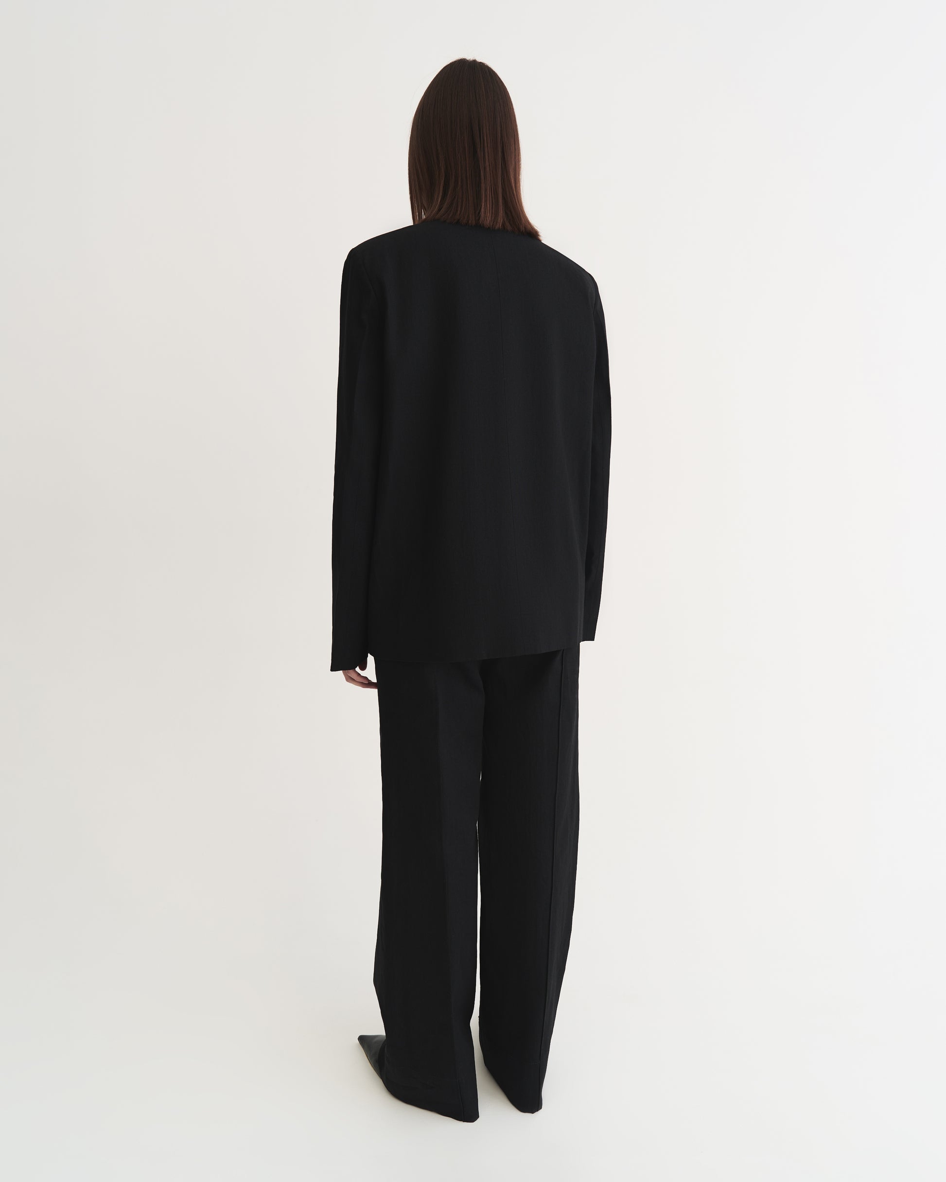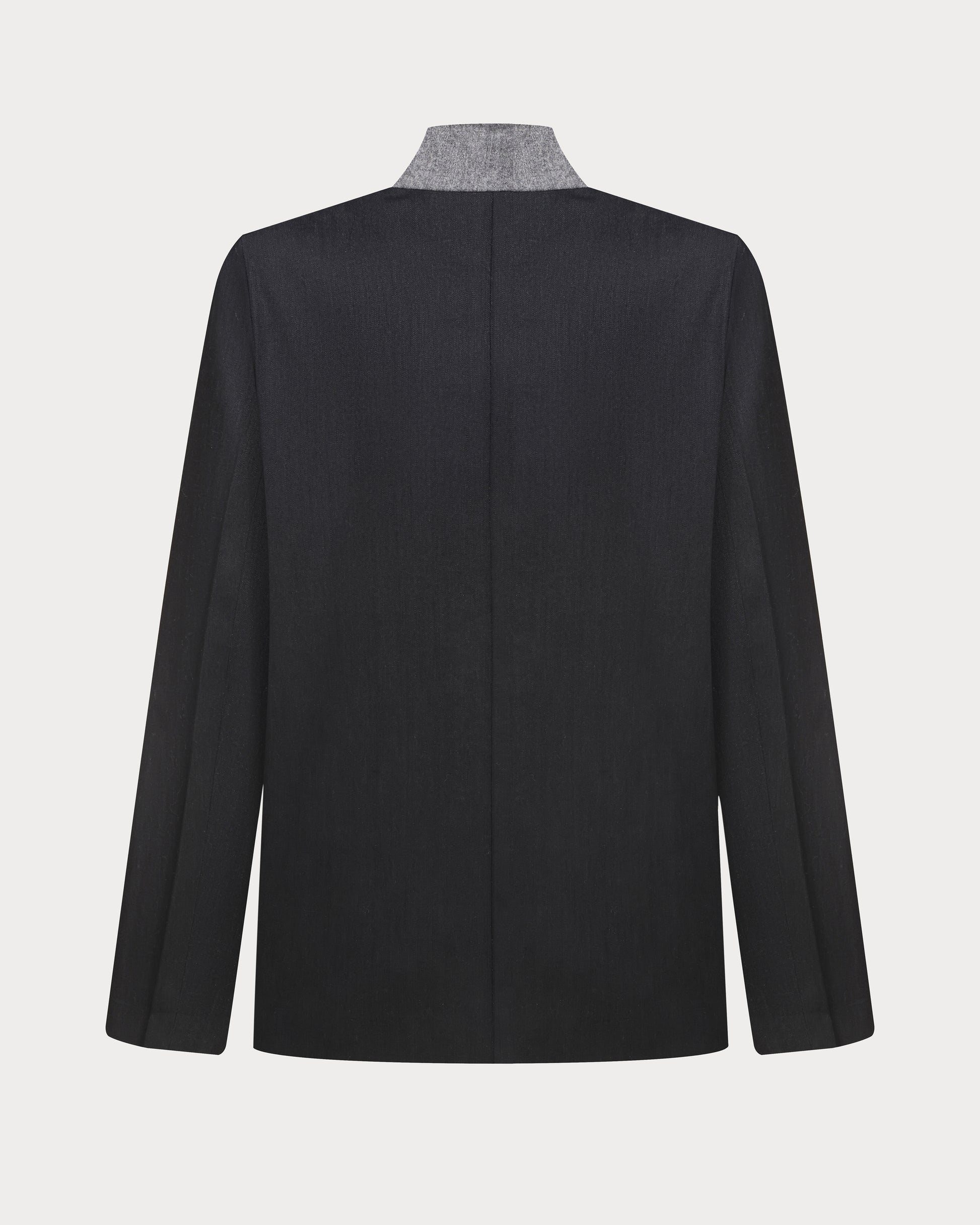 This black denim jacket defined by a clean, structured line, designed for both daytime and evening wear. The high wool collar adds shape and a subtle point of focus, while metal buttons bring a refined, graphic touch. Finished with patch pockets and gentle crease detailing. Style with the CAELI jeans for a modern, polished look.